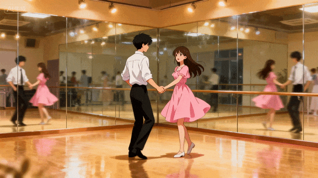 Prompt: 四周都是镜子的舞蹈房内,女生牵着男生的手优雅旋转翩翩起舞,动作流畅一致,衣裙随舞步轻盈摆动,镜面反射出舞蹈全景,镜头缓慢环绕捕捉舞蹈细节。