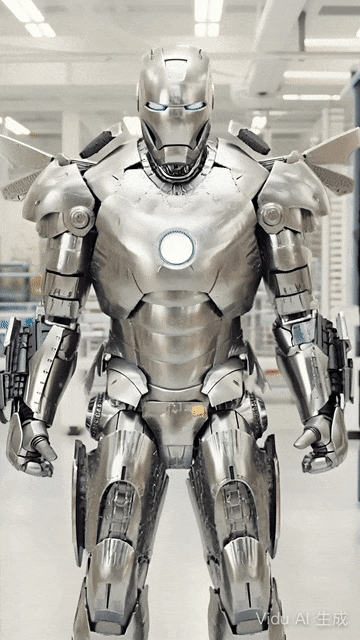 提示词:[@图1][@图2]图1机器盔甲和图2的人一样大,图1贴合在它里面的图2的人图1机器盔甲机甲外形保持不变,头盔掀起露出图2人的脸胸甲从中间收缩打开露出人的上半身手臂部机甲从手臂中间收缩打开露出人的手臂腿部机甲从腿部中间收缩打开露出人的腿除了打开的部分,机甲其他部分保持连接在一起不断开,机甲后背不变图2人物的手臂从机甲手臂里出来,腿从机甲的腿出来,人物整体从机甲里面走出来镜头全景所有变形都通过机械传动装置