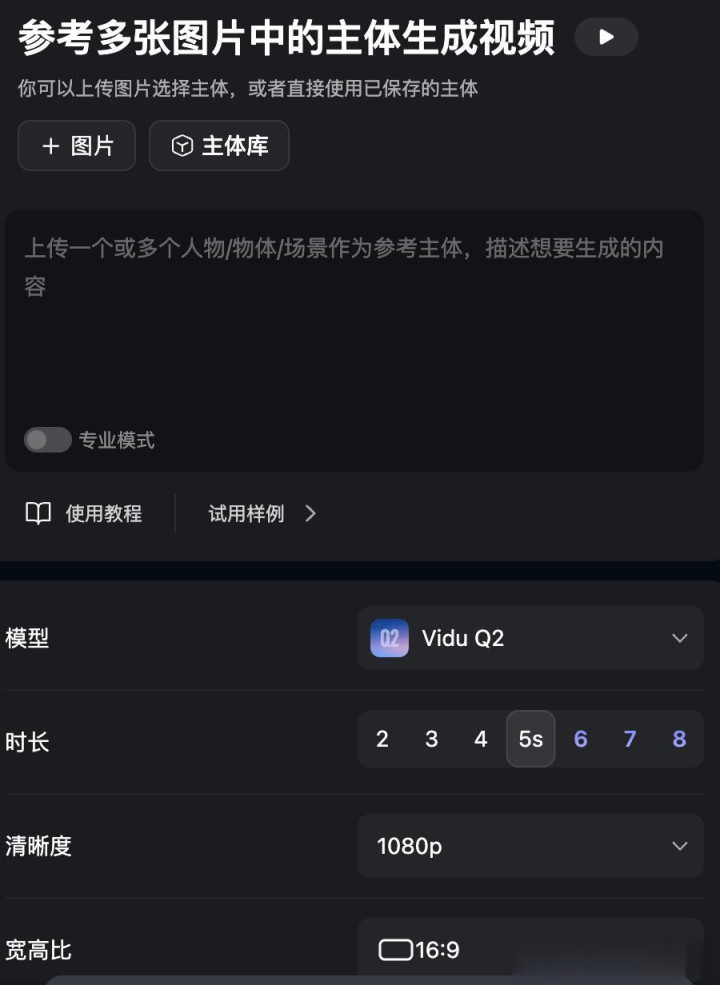 将主角三视图输入到Vidu参考生功能的主体库中: