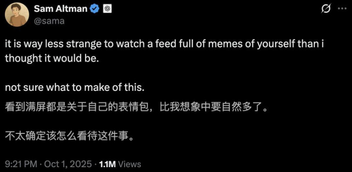 奥特曼表示虽然信息流里出现的自己的梗图,没想象中奇怪,但仍有些迷惑。