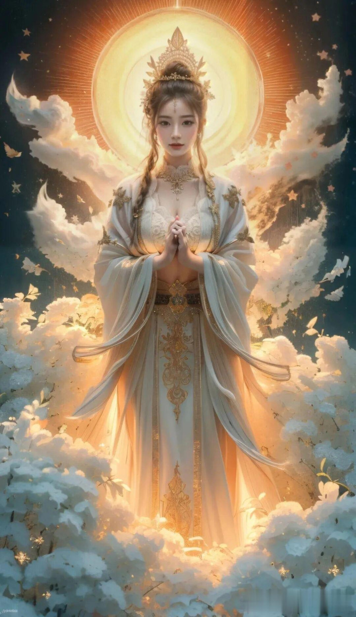 Prompt:女孩闭上眼睛,身后的云朵飞舞,发出金光