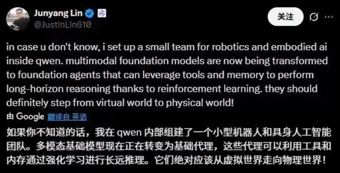 10月8日,阿里巴巴通义千问技术负责人林俊旸在社交平台发布了一条简短但分量十足的消息:团队已正式建立“机器人和具身智能小组”。